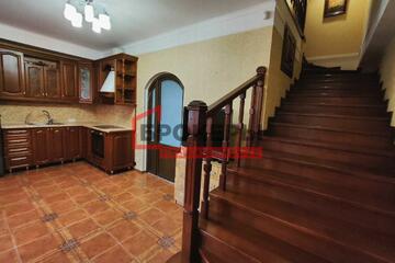 Столовая - 24.1м2, кухня и лестница из натурального дуба, мягкая мебель. Лестница не винтовая, очень удобная, габаритные вещи проходят в проемы.