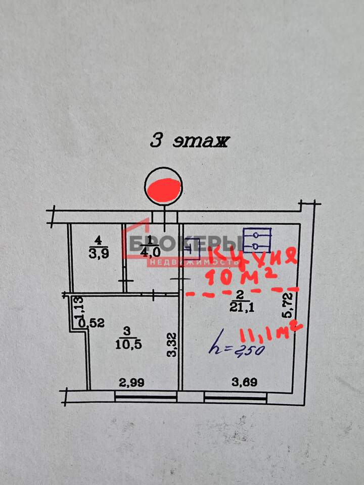 Комнаты раздельные: 10,5 и 11,1 м2, кухня 10 м2, санузел совмещен.