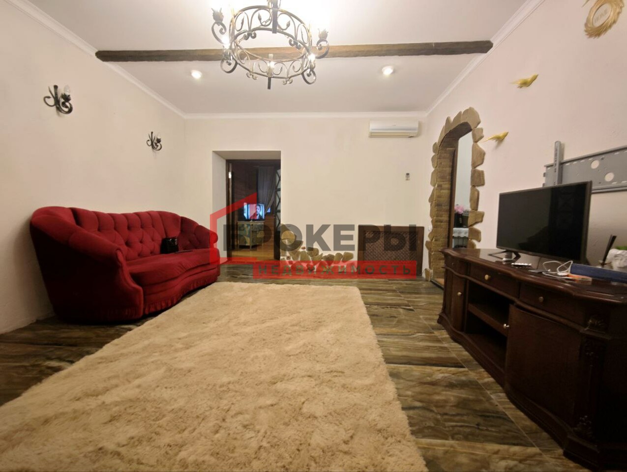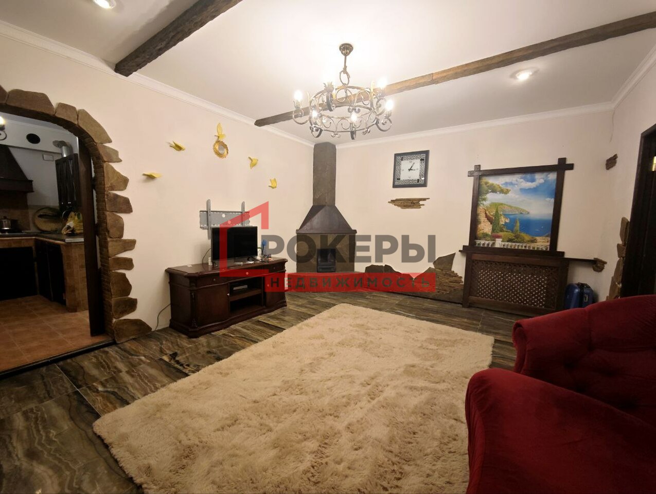 Дизайн квартиры выполнен в стиле шале из высококачественных материалов: керамогранит, дерево, ковка...
