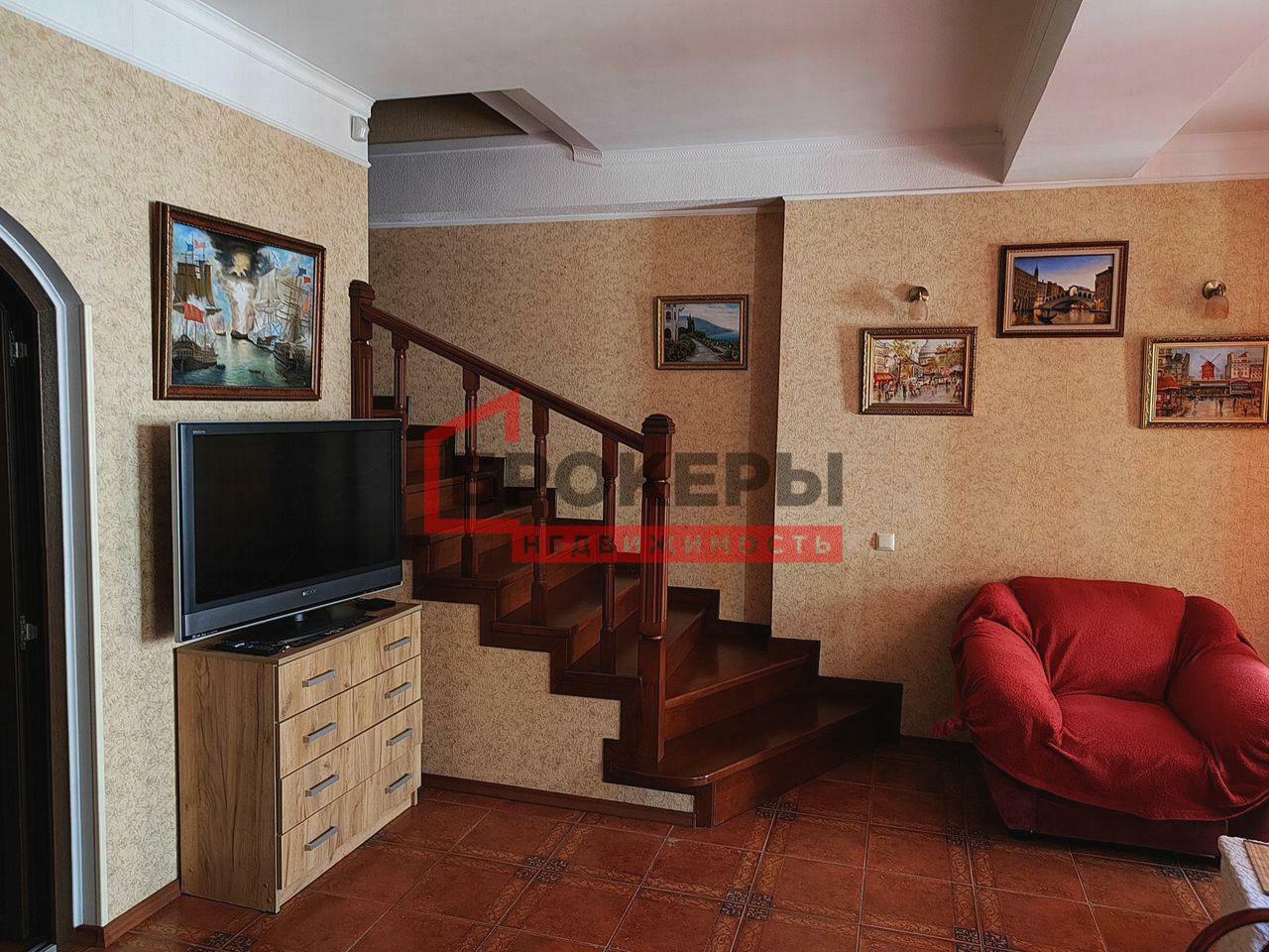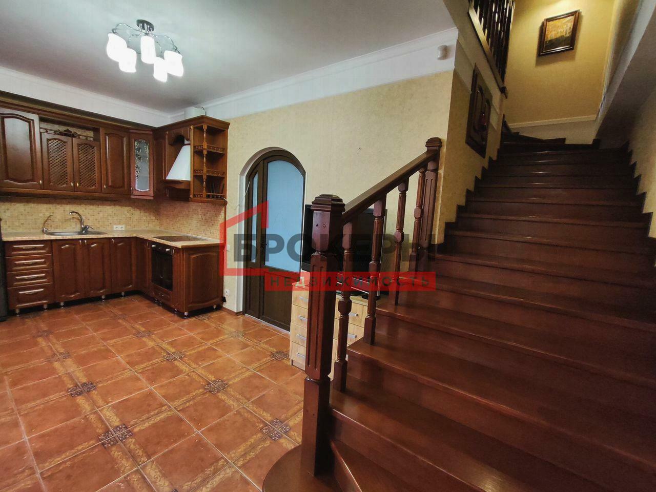 Столовая - 24.1м2, кухня и лестница из натурального дуба, мягкая мебель. Лестница не винтовая, очень удобная, габаритные вещи проходят в проемы.