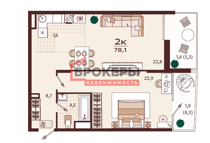 -Террасы площадью - 5,3 м2 и 6,3 м2