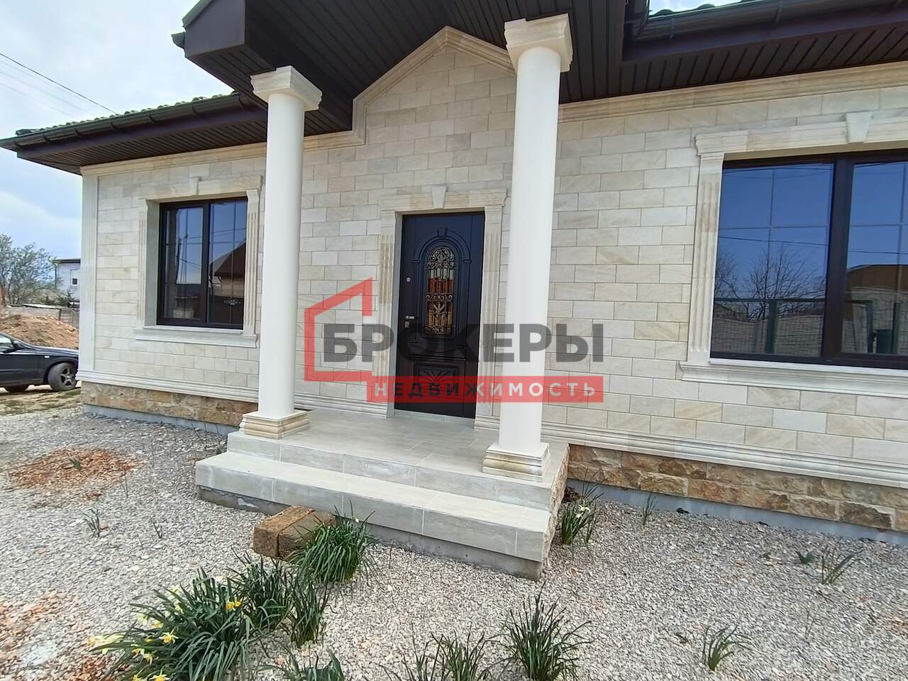 Фасад дома облицован натуральным дагестанским камнем с античными декоративными элементами.